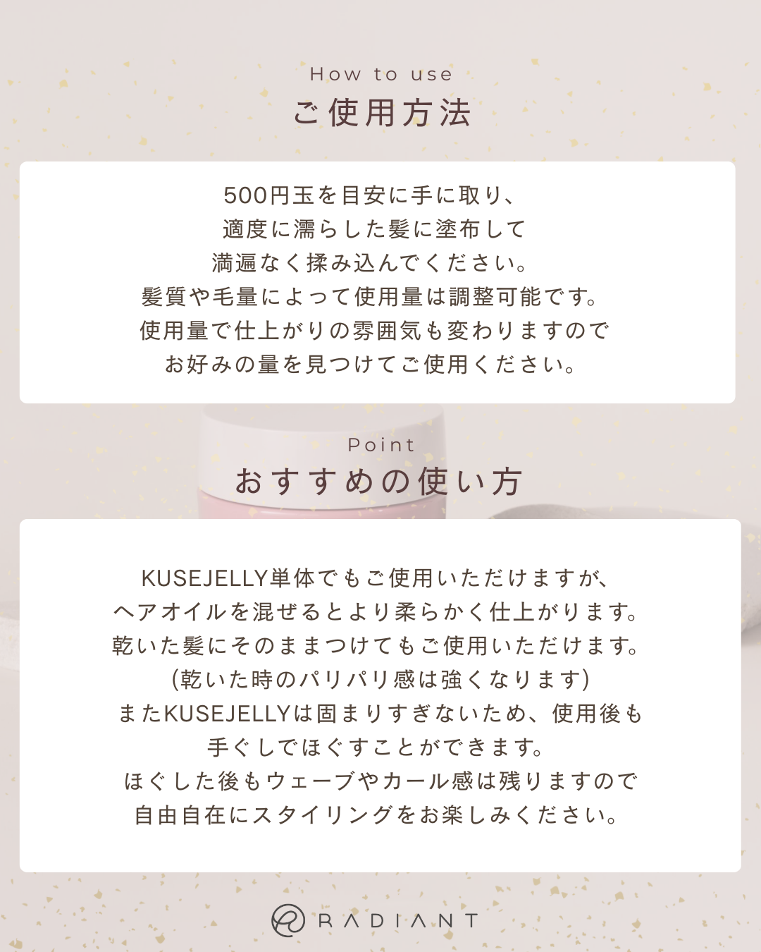 KUSEJELLY単体でもご使用いただけますが、ヘアオイルを混ぜるとより柔らかく仕上がります。