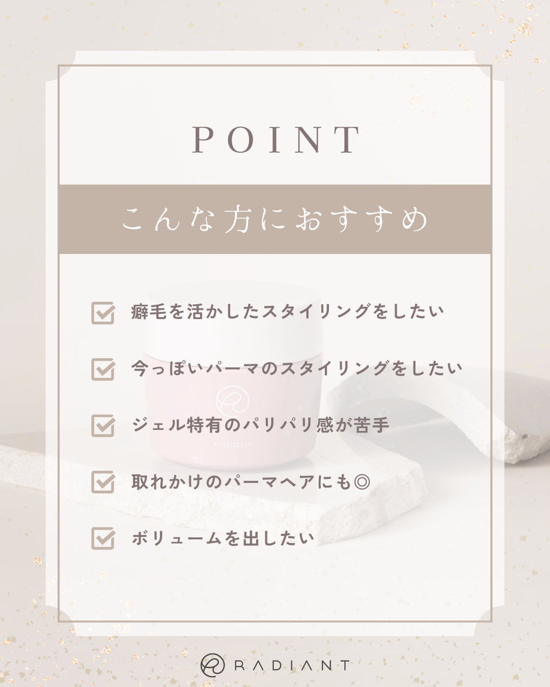 程よいホールド力と適度なツヤ感を残せるスタイリング剤。