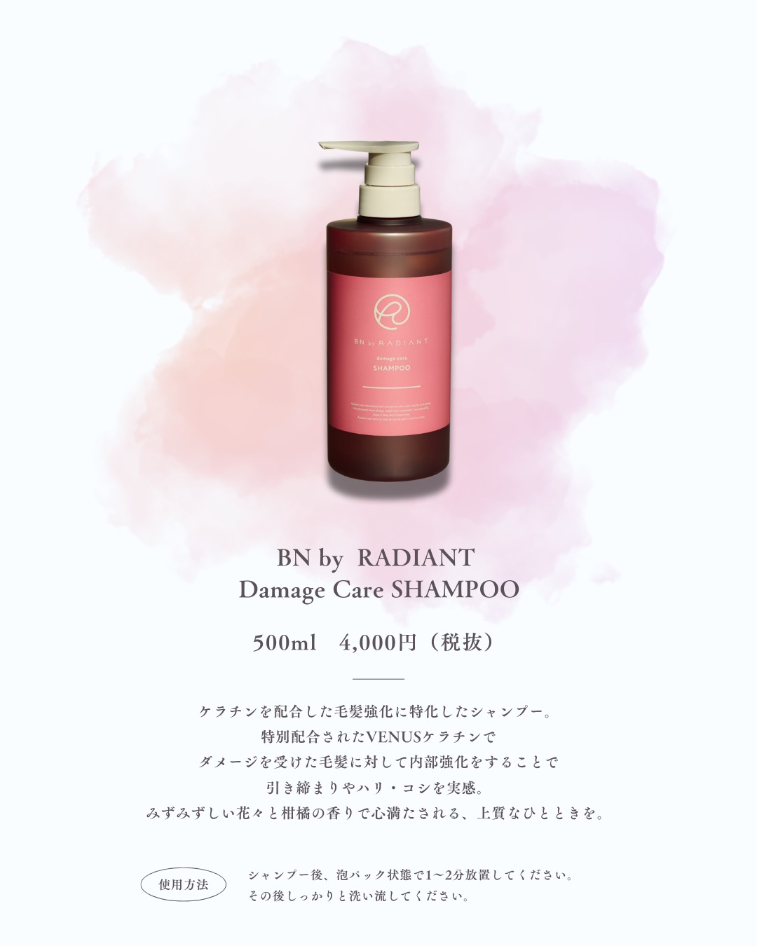 ※ラディアントシャンプーは補習効果が高いため、洗い上がりに少しきしむ感触がございますので、シリーズでトリートメントと合わせてお使いいただくことをオススメします。