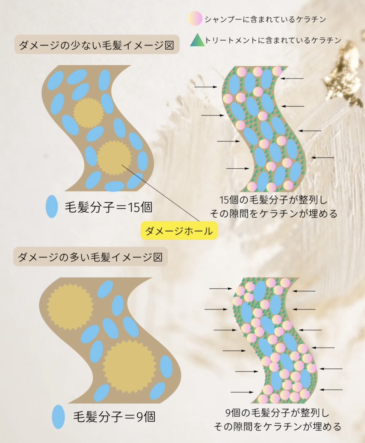 加齢や施術ダメージにより、乱れてしまった毛髪分子を適正な位置に動かしながら整え、ダメージホールを改善し、