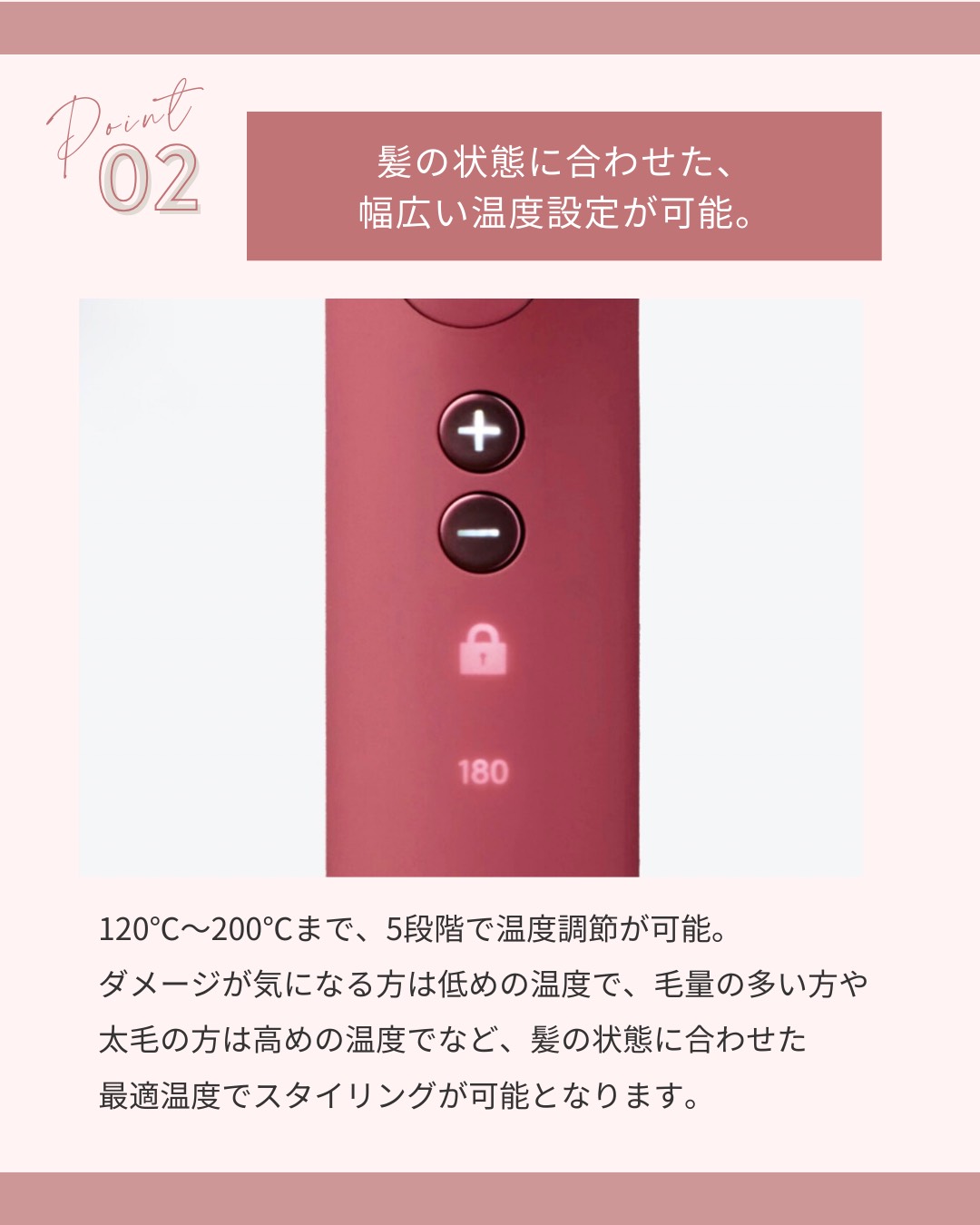 ダメージが気になる方は低めの温度で、毛量が多い方や太毛の方は高めの温度でなど、髪の状態に合わせた最適温度でスタイリングができます。