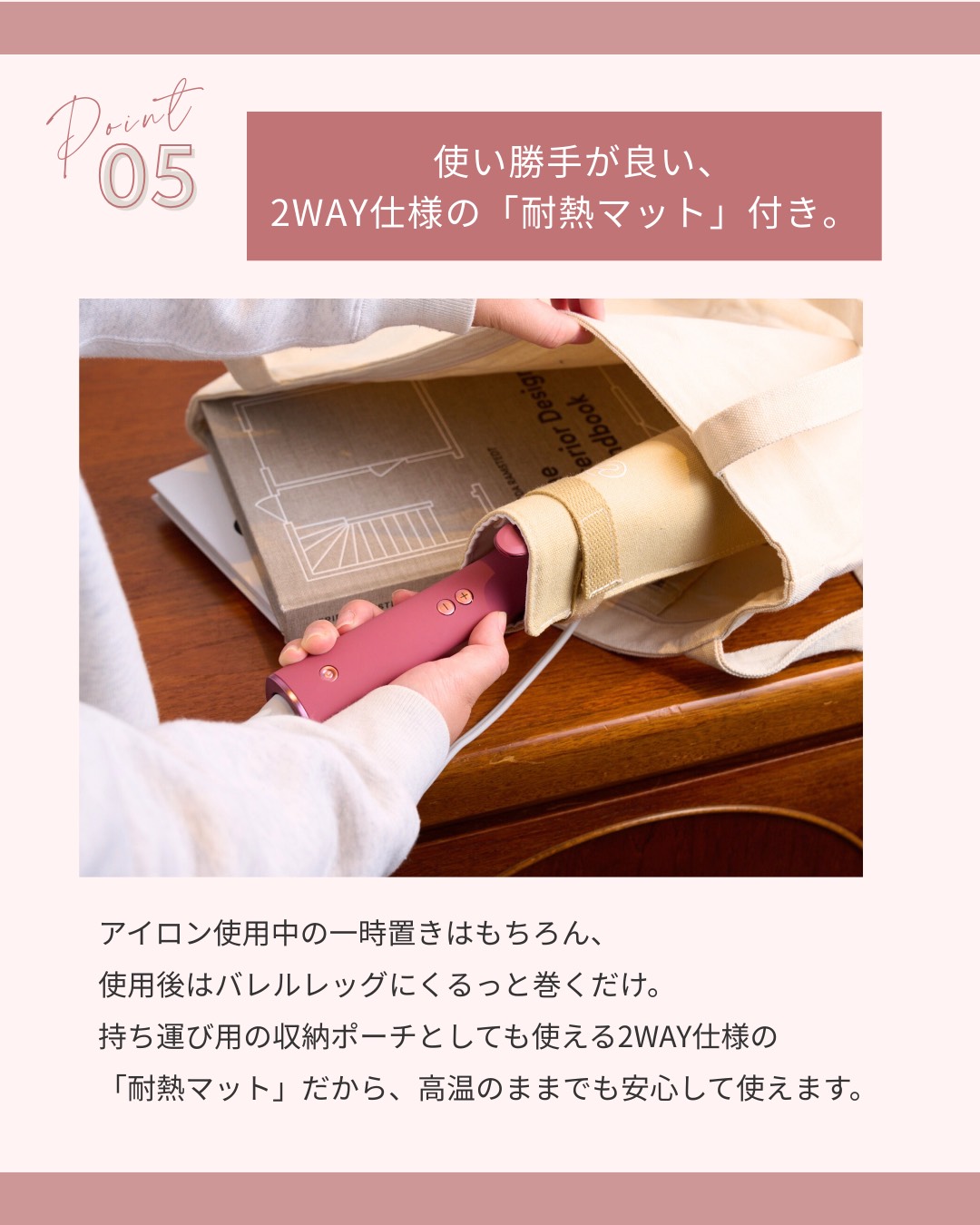 アイロン使用中の一時置きはもちろん、使用後はバレル部分にくるっと巻くだけ。持ち運び用の収納ポーチとしても使える2WAY仕様の「耐熱マット」だから、高温のままでも安心して使えます。